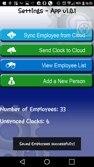 Set up the app as described in the manual. You can then sync employees, upload clockings, view current employees on the database and add new employees.